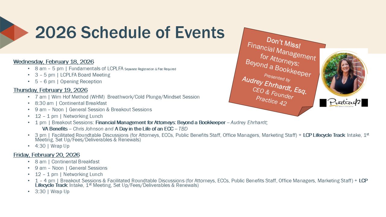This event promises to be a remarkable opportunity for networking, professional development, and sharing innovative ideas within our community. With registration fees set at $599 for LCPLFA members and $799 for non-members, we encourage all elder care law professionals to seize this chance to invest in their growth and connect with like-minded individuals.